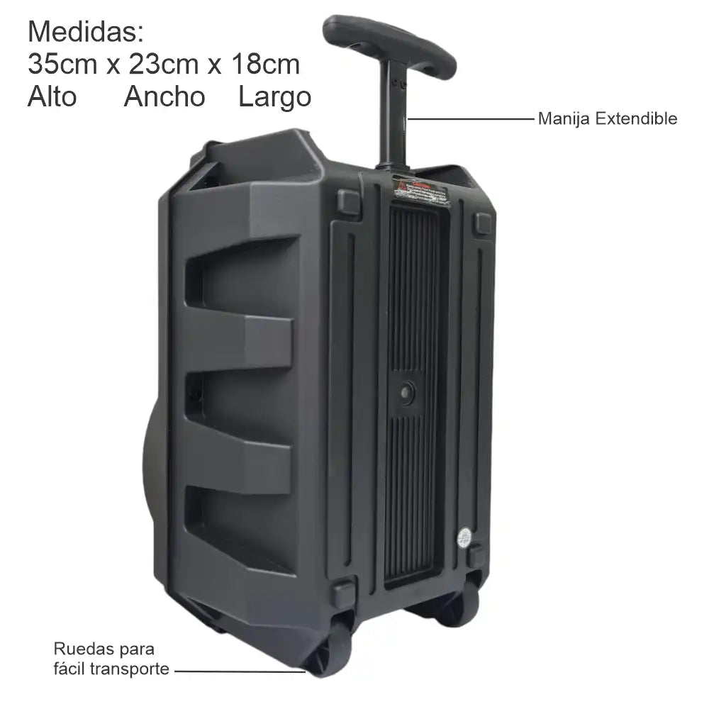 (Bluetooth, USB, microSD, AUX 3.5 mm), este parlante es perfecto para cualquier ocasión. ¡Incluye micrófono, radio FM y control remoto para mayor comodidad!