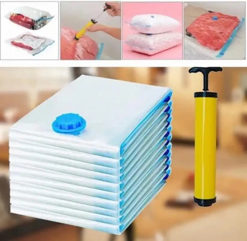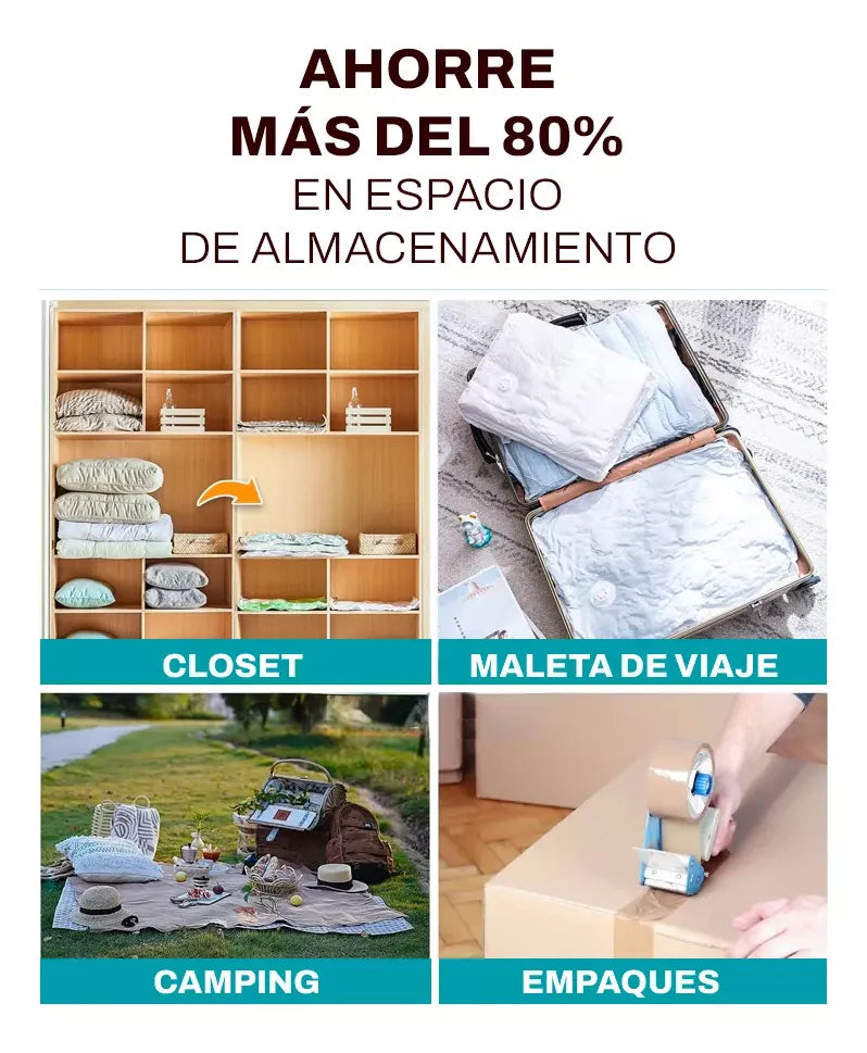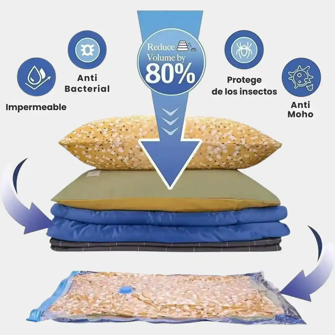 Estas bolsas de almacenamiento al vacío reducirán hasta un 80% del volumen de tus prendas y artículos del hogar, haciendo que viajes y organices tu hogar con total facilidad y sin preocupaciones.