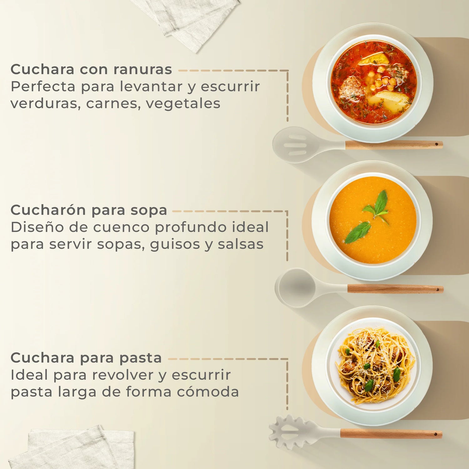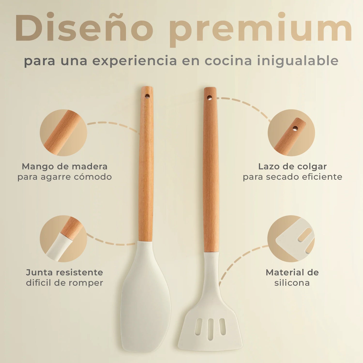 Este juego de utensilios de cocina utiliza silicona de grado alimenticio resistente a altas temperaturas y sin BPA,